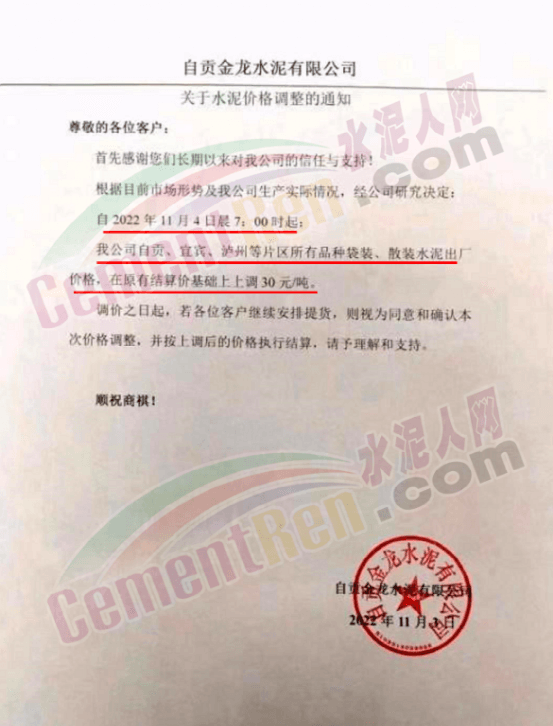 自貢金龍水泥有限公司通知,自11月4日晨7時起,公司自貢、宜賓、瀘州等片區所有品種袋裝、散裝水泥出廠價上調30元/噸。