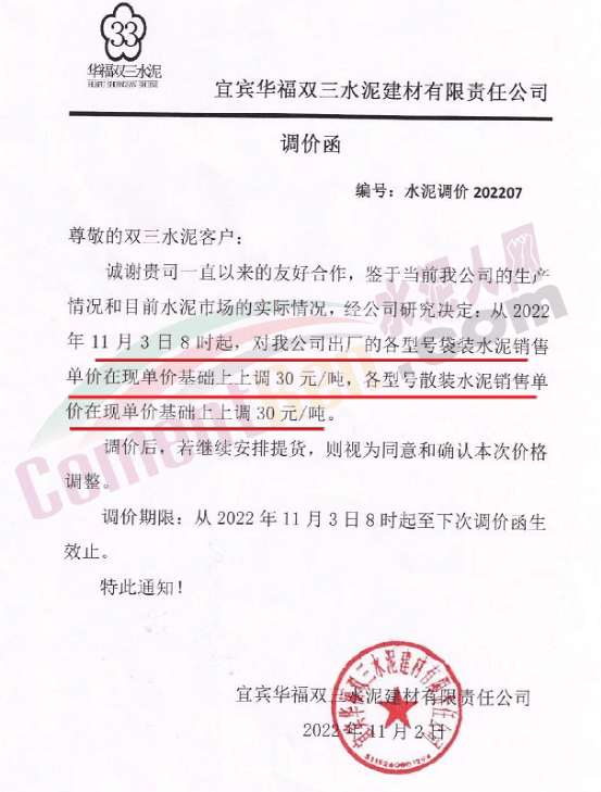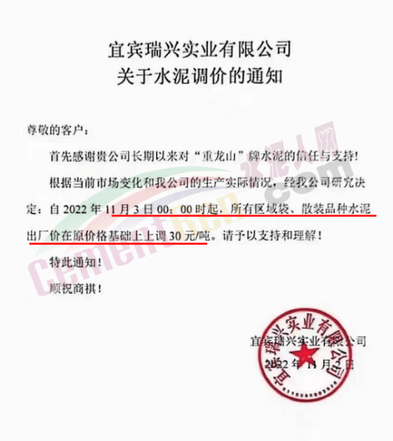 宜興實業有限公司通知,根據當前市場變化和公司的生產實際情況,經公司研究決定自2022年11月3日0時起,所有區域袋、散裝品種水泥出廠價在原價格基礎上上調30元/噸。
