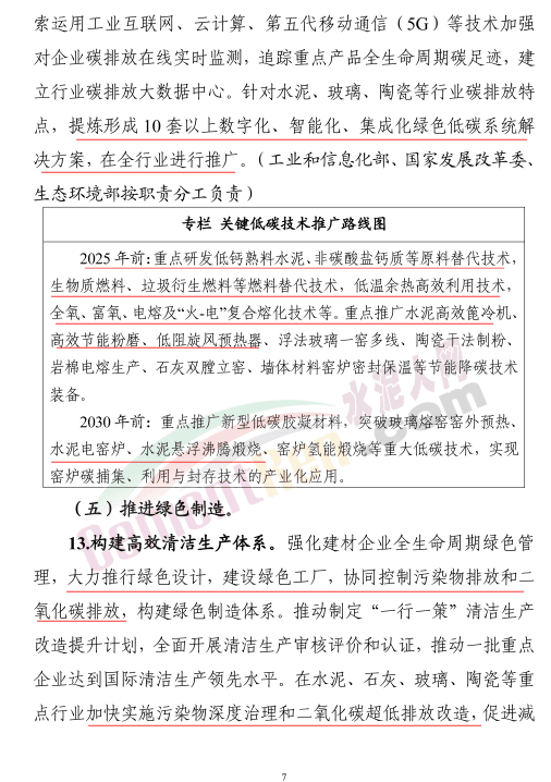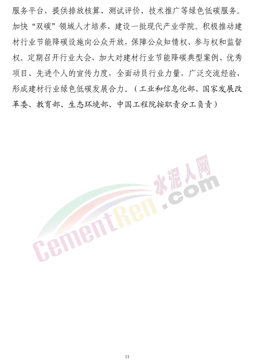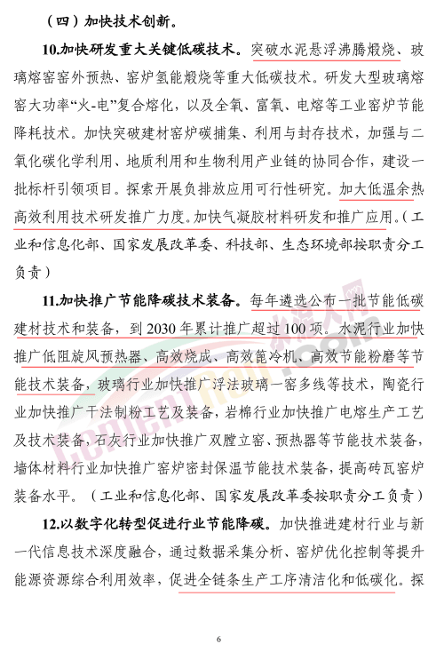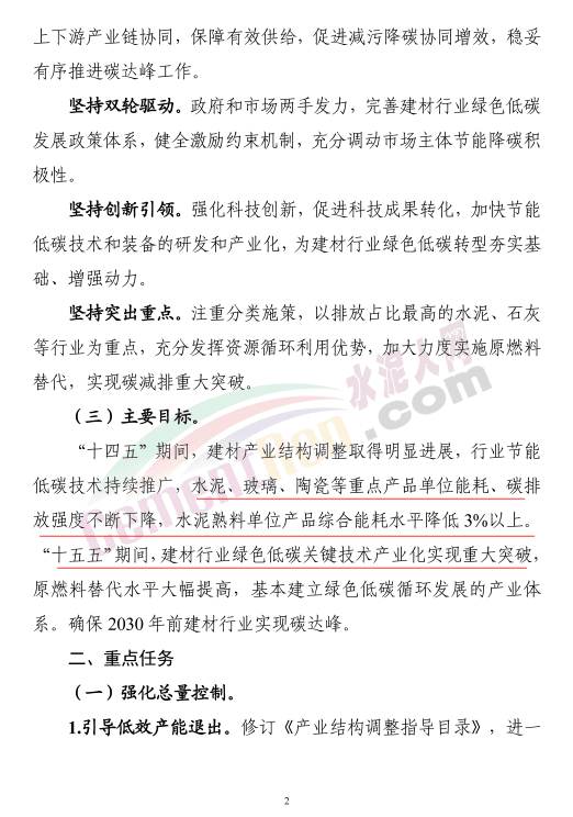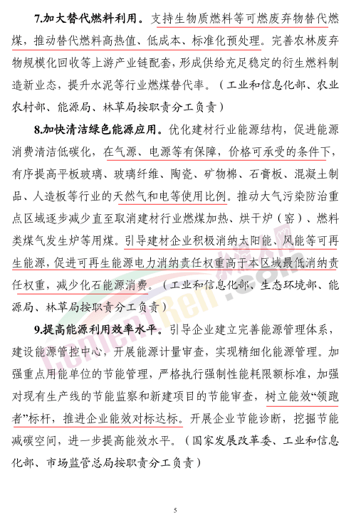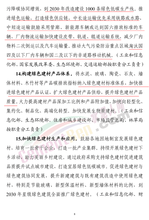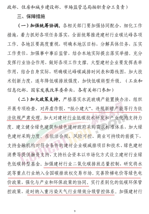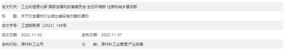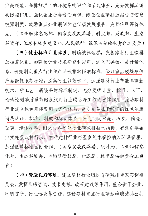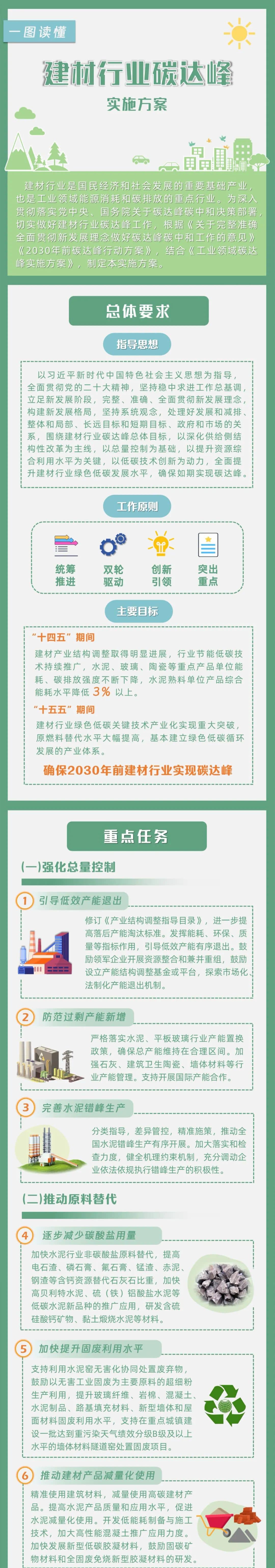 工業和信息化部、國家發展和改革委員會、生態環境部、住房和城鄉建設部等四部門聯合印發《建材行業碳達峰實施方案》,方案提出“十四五”期間,建材產業結構調整取得明顯進展,行業節能低碳技術持續推廣,水泥、玻璃、陶瓷等重點產品單位能耗、碳排放強度不斷下降,水泥熟料單位產品綜合能耗水平降低3%以上。“十五五”期間,建材行業綠色低碳關鍵技術產業化實現重大突破,原燃料替代水平大幅提高,基本建立綠色低碳循環發展的產業體系。確保2030年前建材行業實現碳達峰。 一圖讀懂《建材行業碳達峰實施方案》 ↓↓↓