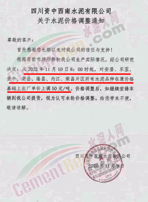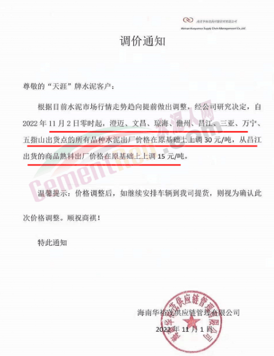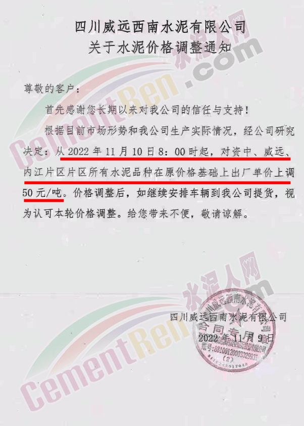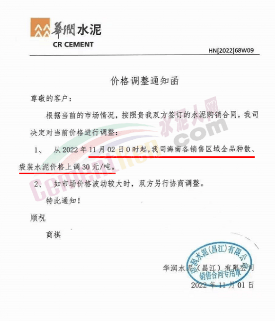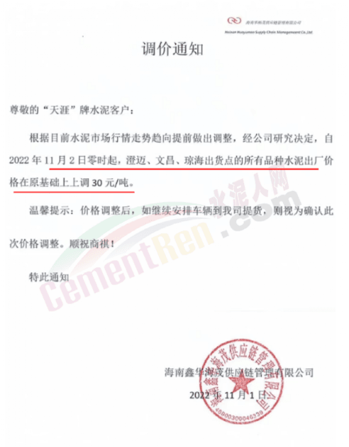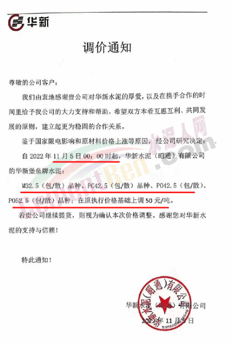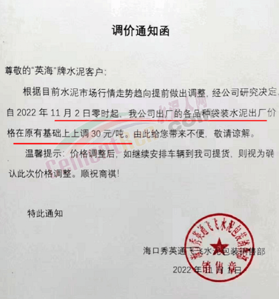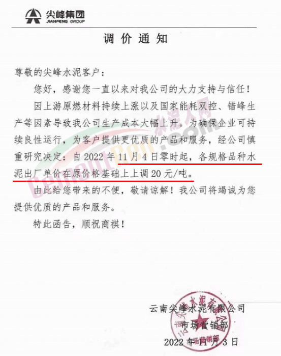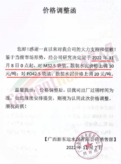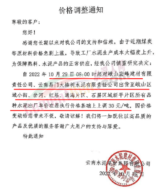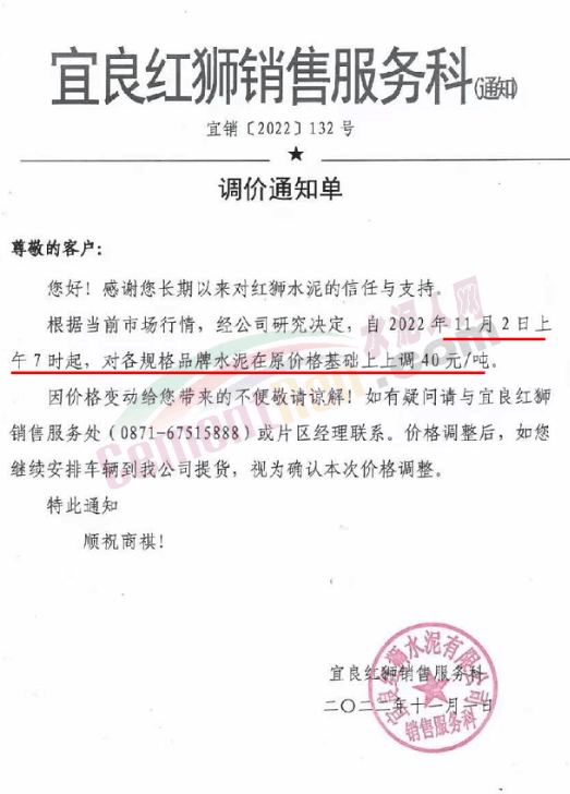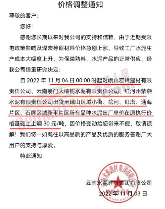 11月2日-3日昆明、楚雄地區通知上調水泥價格20-40元/噸;宜良紅獅銷售服務科通知,根據當前市場行情,經公司研究決定,自2022年11月2日上午7時起,對各規格品牌水泥在原價格基礎上上調40元/噸。