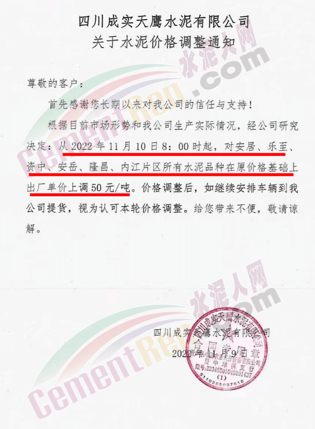 四川成實天鷹水泥有限公司通知,從11月10日8時起,對安居、樂至、資中、安岳、隆昌、內江片區所有水泥品種出廠價上調50元/噸。