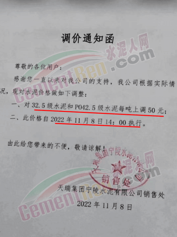 河南天瑞集團寧陵水泥有限公司銷售處通知,自11月8日14時起對32.5級水泥和P.O42.5級水泥上調50元/噸。