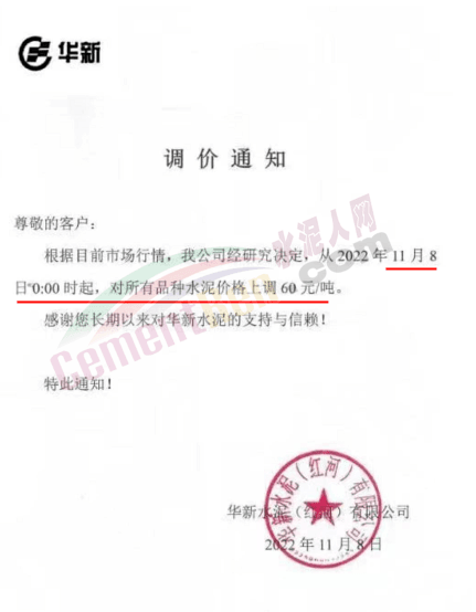 華新水泥(紅河)有限公司通知,11月8日0時起,對所有品種水泥價格上調60元/噸。