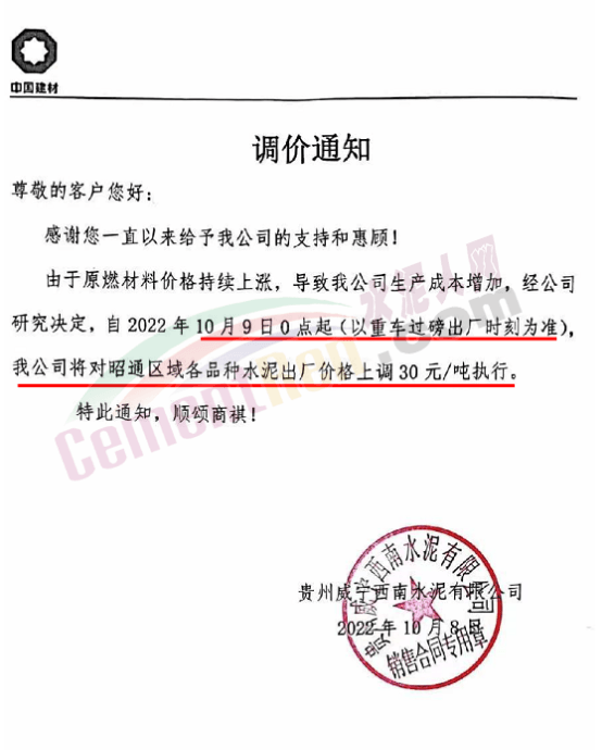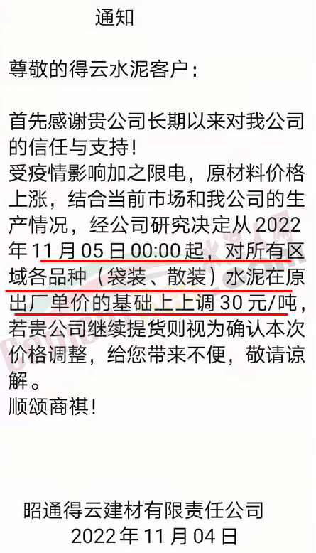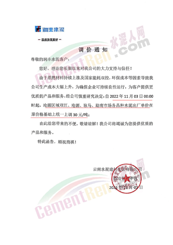 云南水泥建材集團有限公司臨滄銷售中心通知,由于原燃材料持續上漲及國家能耗雙控,環保成本等因素導致公司生產成本大幅上升,為確保企業可持續良性運行,為客戶提供更優質的產品和服務,經公司慎重研究決定,自2022年11月3日0時起,滄源區域雙江、滄源、耿馬、勐南市場各品種水泥出廠單價在原價格基礎上統一上調30元/噸。