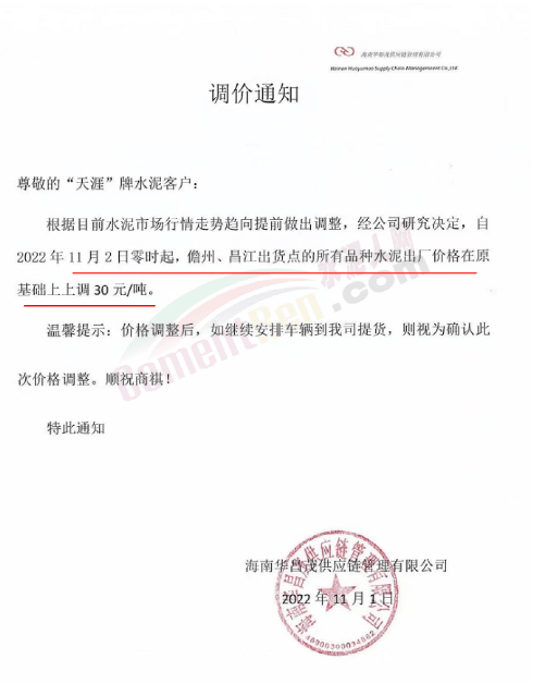 原燃材料價格上漲,企業生產壓力較大,加之市場需求略有回升,廠家漲價意愿強烈。為提升盈利,11月2日起海南地區主要品牌企業通知上調水泥價格30元/噸。