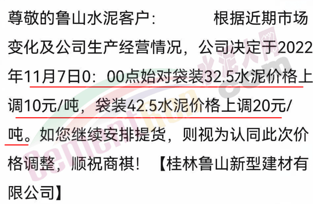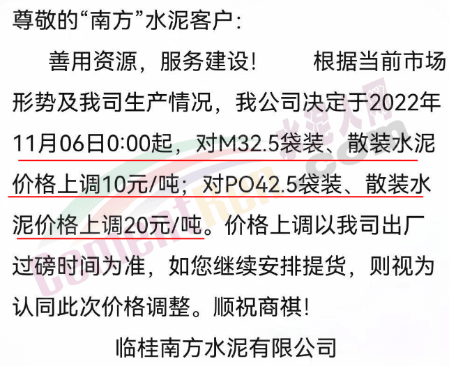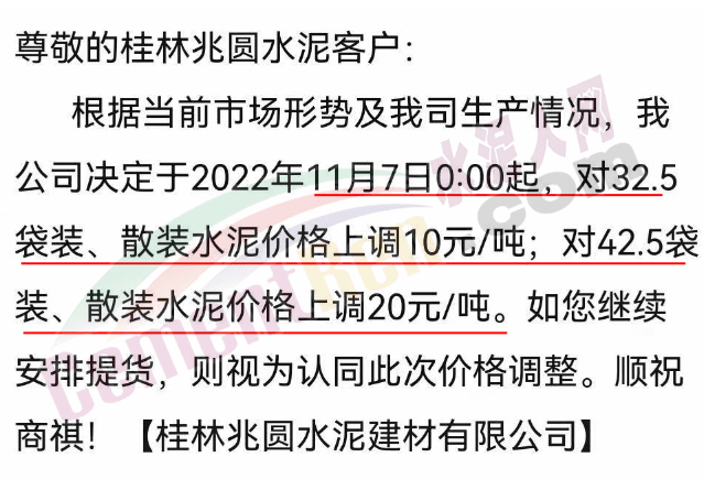 廣西桂林主要品牌企業通知11月6-7日起對M32.5袋裝、散裝水泥價格上調10元/噸對PO42.5袋裝、散裝水泥價格上調20元/噸。