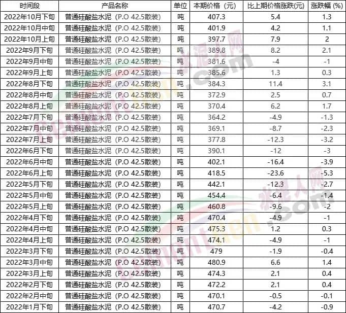 據國家統計局公布的流通領域市場價格變動情況10月下旬42.5散裝水泥報價407.3元/噸,同比上年同期618.9元/噸仍有211.6元/噸的差距。
