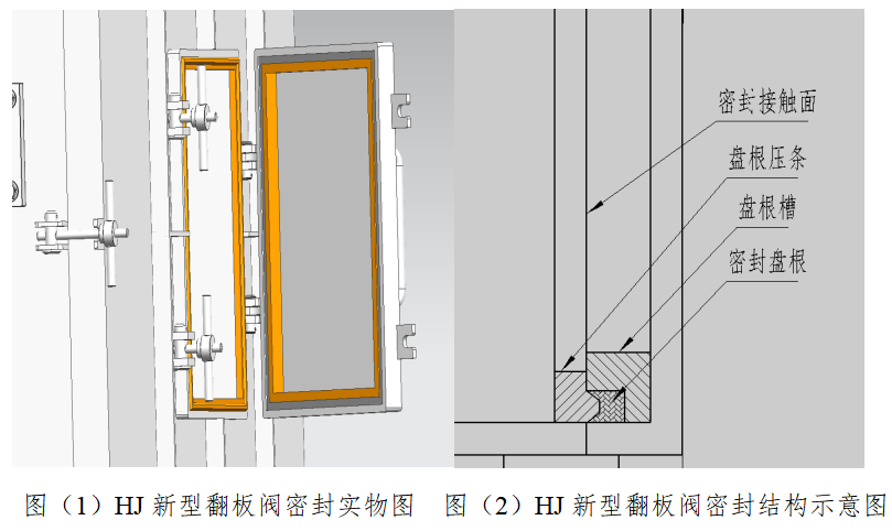 目前市場上翻板閥為解決閥體漏料,大多采用在各孔門接觸面上壓裝盤根起到壓緊密封的作用。觀察孔、清堵門由于使用過程中需要頻繁的開合,盤根很難完好地貼合在接觸面上,而且頻繁地更換盤根不僅麻煩且存在一定的危險因素。檢修門由于接觸面積較大,金屬受熱變形常導致接觸面間夾緊受力不均,部分區域漏風。