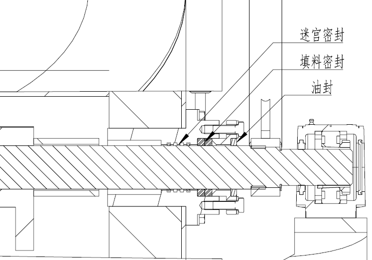 針對上述問題,HJ新型翻板閥設計思路是將密封和轉動兩個相互矛盾問題拆開后分別處理。由內而外設置迷宮、填料、油封三層密封結構(見圖3)。其中迷宮、油封結構不直接與轉動軸接觸,迷宮結構內部設置引流環,可提前大幅度卸去沖擊到填料上面的瞬時正壓,由于接觸填料的瞬時正壓變低,填料密封的效果更加顯著。設置在最外端的油封既可以減少外部粉塵進入填料,也可以再次降低漏料幾率。