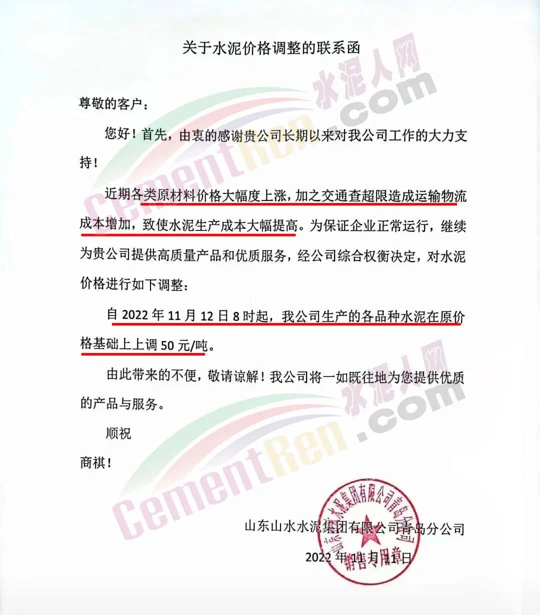 山東山水水泥集團有限公司青島分公司通知稱,近期各類原材料價格大幅上漲,加之交通查超限造成運輸物流成本增加,致使水泥生產成本大幅提高。為保證企業正常運行,經公司綜合權衡決定,自11月12日8時起,公司生產的各品種水泥在原價基礎上上調50元/噸。