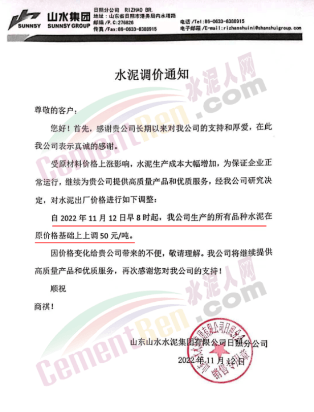 山東山水水泥集團有限公司日照分公司通知,受原材料價格上漲影響,水泥生產成本大幅增加,為保證企業正常運行,自11月12日早8時起,上調水泥價格50元/噸。