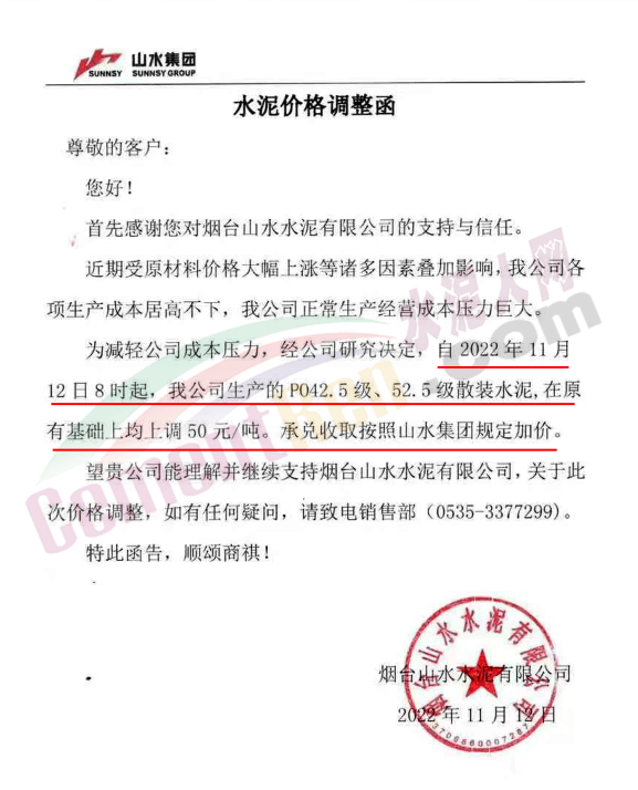山東省煙臺山水水泥有限公司通知受原材料價格上漲影響,水泥生產成本大幅增加,為保證企業正常運行。11月12日早8時起,公司生產的所有品種水泥在原價基礎上上調50元/噸。