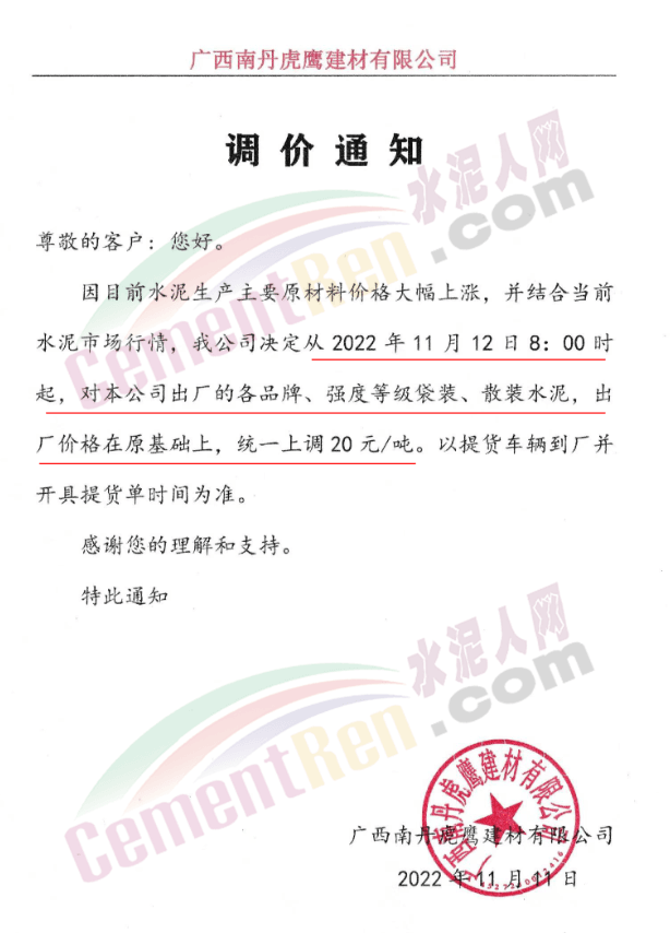 廣西壯族自治區河池市南丹縣廣西南丹虎鷹建材有限公司通知因目前水泥生產主要原材價格大幅上漲,并結合水泥市場行情 ,公司決定從11月12日8時起,對公司出廠的各品牌、強度等級水泥出廠價在原基礎上統一上調20元/噸。