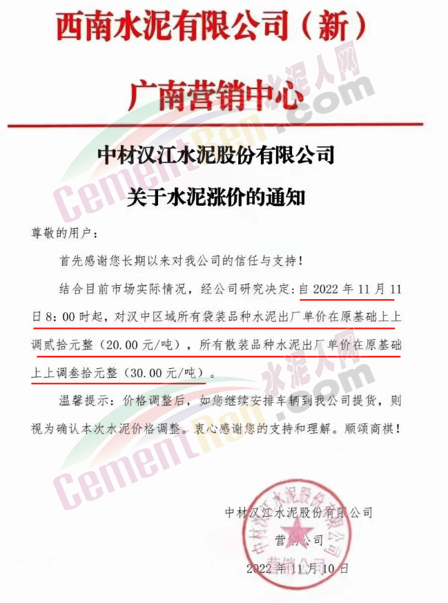 陜西省漢中市西南水泥廣南營銷中心中材漢江水泥通知結合目前市場實際情況,經公司研究決定自11月11日8時起,對漢中區域所有袋裝品種水泥出廠單價上調20元/噸。所有散裝品種水泥出廠價上調30元/噸。