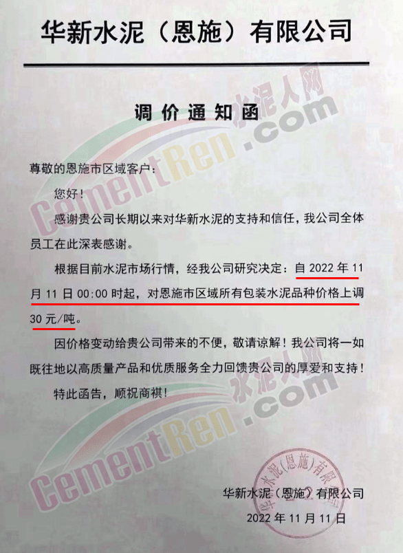 湖北省恩施土家族苗族自治州恩施市華新水泥(恩施)有限公司通知,根據當前水泥市場行情經公司研究決定,自11月11日0時起,對恩施區域所有包裝水泥價格上調30元/噸。