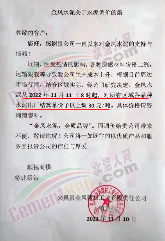 湖北省恩施土家族苗族自治州來鳳縣金鳳建材工業有限責任公司通知,因受疫情的影響,各種原燃材料價格上漲,運輸限載等導致公司生產成本上升,根據目前周邊市場行情 ,結合區域實際,經公司研究決定金鳳水泥從11月11日8時起,對所有區域各品種水泥出廠價上調30元/噸。