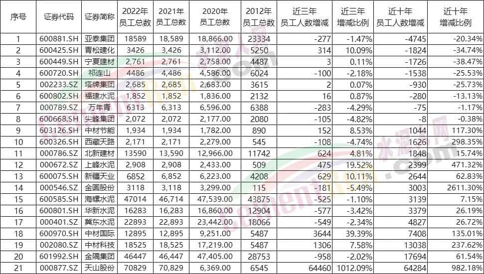 水泥行業A股21家上市公司數據可見,近3年來有10家企業出現不同幅度的減員,其中金隅集團958人,華新水泥、海螺水泥減員也都在500人以上。