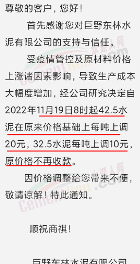 山東省菏澤市巨野東林水泥有限公司通知,受疫情管控及原材料價格上漲諸因素影響,導致生產成本大幅度增加,經公司研究決定自2022年11月19日8時起42.5水泥在原來價格基礎上每噸上調20元,32.5水泥每噸上調10元,原價格不再收款。