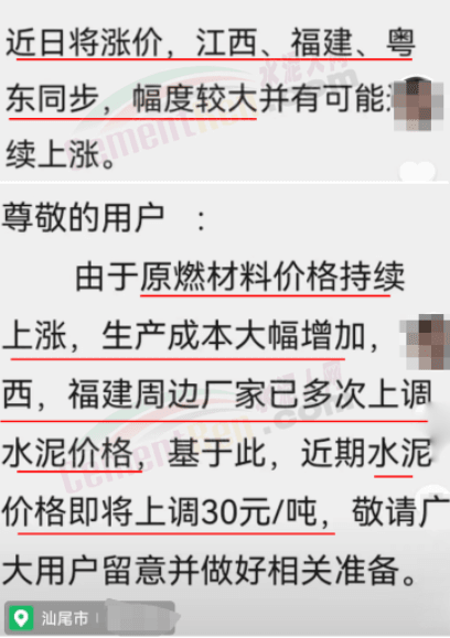 廣東汕尾區域某水泥銷售企業通知,近日水泥價格將上漲,江西、福建、粵東區域剛同步調漲,且幅度較大,并有可能繼續上漲。
