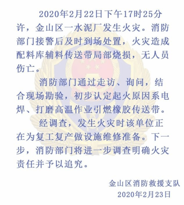 2020年2月22日下午5點25分許,上海金山區一水泥廠發生火災。消防部門接警后及時到場處置,火災造成配料庫輔料傳送帶局部燒損,無人員傷亡。消防部門通過走訪、詢問,結合現場勘驗,初步認定起火原因系電焊、打磨高溫作業引燃橡膠傳送帶。