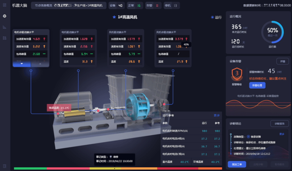 系統平臺解決了維修人員經驗不足、每次處理故障及產線停機維修間隔時間過長的問題。平臺系統內置了故障算法模型,讓故障診斷分析自動化、智能化。此模型建立在對水泥工藝流程設備機理的理解基礎上,常規故障系統自診斷,并自動生成診斷報告,作為設備管理人員輔助診斷分析管理工具,大大提高了設備維修的工作效率,復雜故障由系統平臺的智能診斷和遠程專家診斷,雙診斷模式,有力保障設備維修效率,定位設備故障部位及嚴重程度,減少了設備維修的時間,從而縮短設備停機時間,最大化減少因設備停機對生產任務的影響。