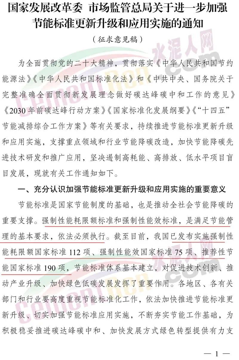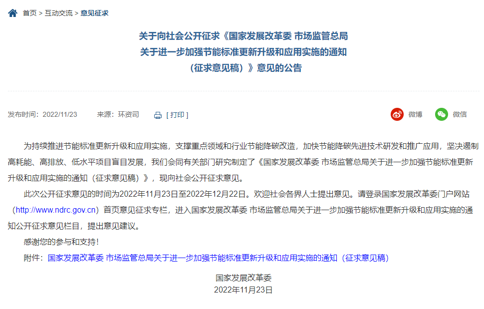 日前,國家發改委發布公告,對《國家發展改革委 市場監管總局關于進一步加強節能標準更新升級和應用實施的通知(征求意見稿)》公開征求意見。