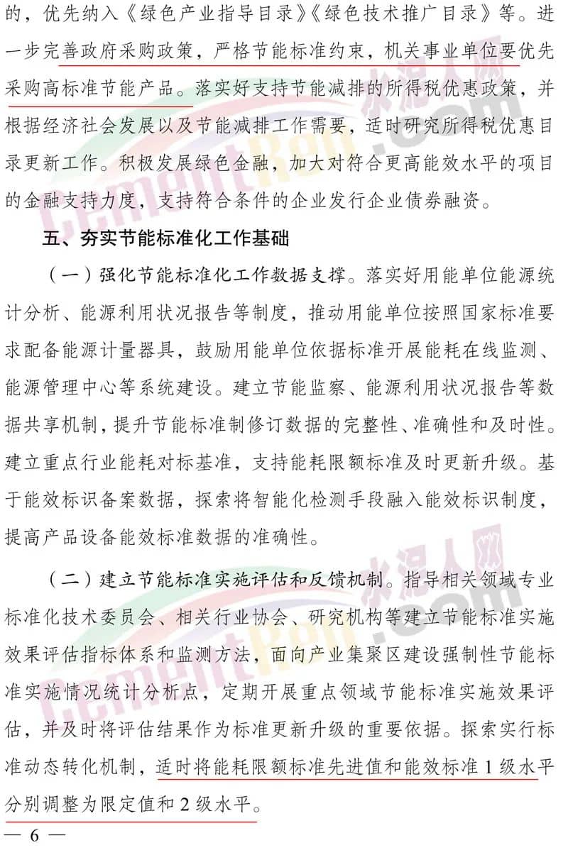 加強綜合性政策支持。對行業主要產品能效水平普遍優于能耗限額標準先進值或主要設備能效普遍優于能效標準1級水平的,優先納入《綠色產業指導目錄》《綠色技術推廣目錄》等。進一步完善政府采購政策,嚴格節能標準約束,機關事業單位要優先采購高標準節能產品。