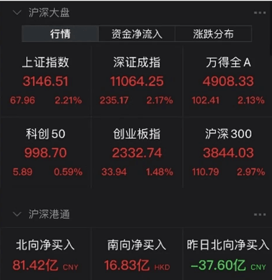 截至上午收盤,上證指數上漲2.21%,深證成指上漲2.17%,創業板指上漲1.48%。北向資金凈流入81.42億元。港股也暴漲,恒生科技指數上午收盤大漲5.45%,重回3600點,恒指、國指分別漲3.85%和4.72%。富時A50期指盤中漲超4%。
