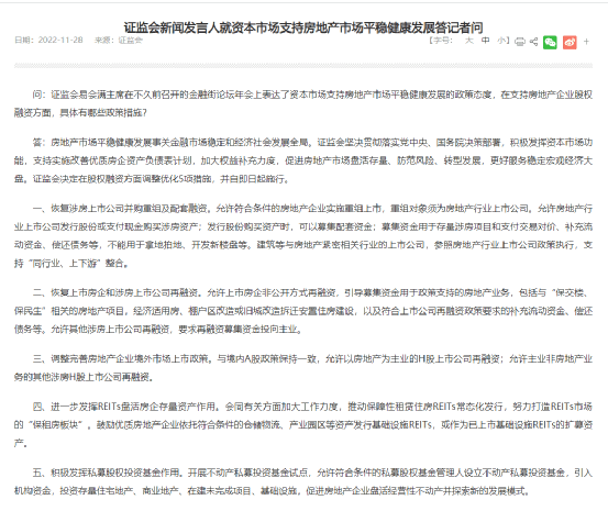 11月28日,證監會新聞發言人表示,證監會決定在股權融資方面調整優化5項措施,并自即日起施行。包括恢復涉房上市公司并購重組及配套融資、恢復上市房企和涉房上市公司再融資等,這被稱為近期利好房地產行業的“第三支箭”。