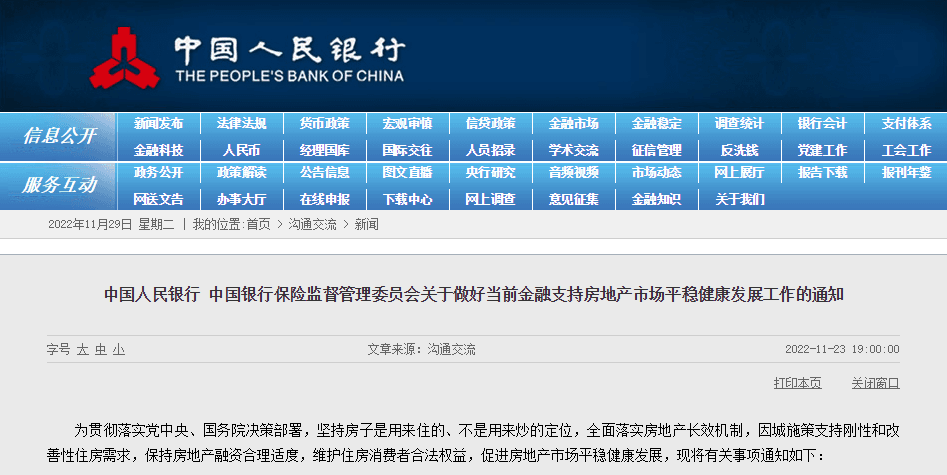 11月23日,《中國人民銀行中國銀行保險監督管理委員會關于做好當前金融支持房地產市場平穩健康發展工作的通知》正式發布。