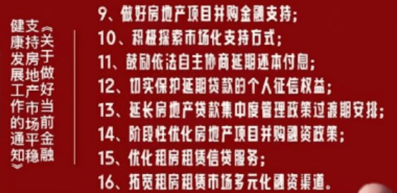 據了解,“三支箭”系列利好政策還包括:適時適度運用降準等貨幣政策工具,保持流動性合理充裕;人民銀行、銀保監會正式發布16條金融舉措,全面支持樓市平穩健康發展。