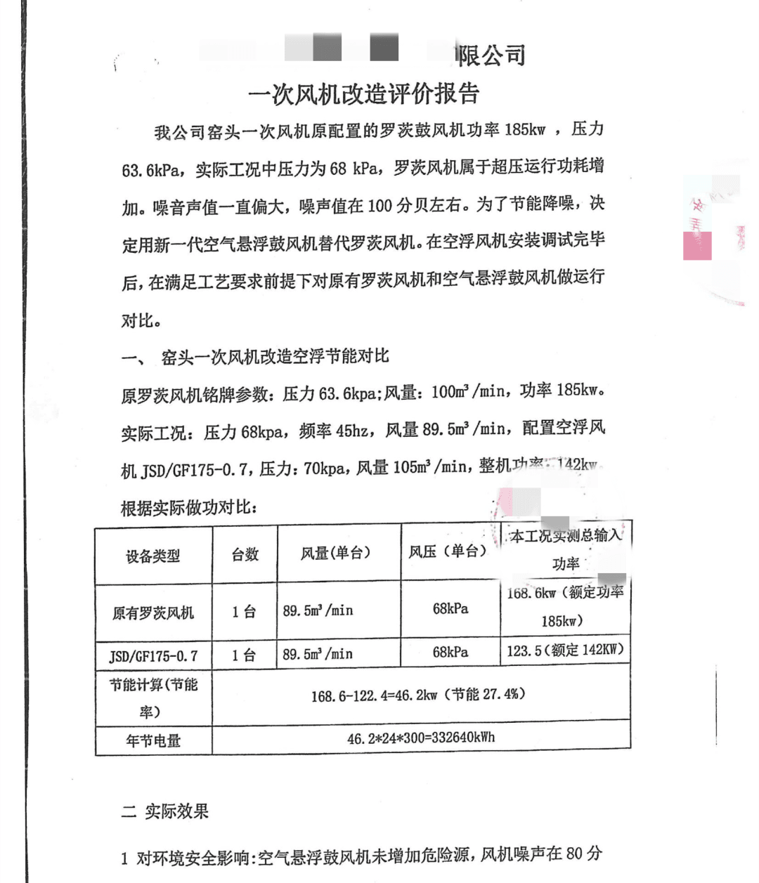 本次窯頭一次風機改造空氣懸浮鼓風機全年可節省332640kwh電量,節能效率達到27.4%,滿足合同(不低于25%)要求,整體噪音下降至80分貝,在滿足工藝要求下達到了節能和噪音控制需求。改造報告如下: