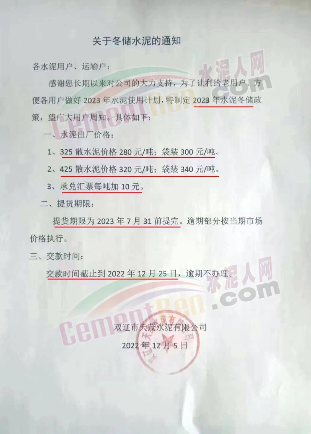 日前,吉林省雙遼市天茂水泥發布《關于冬儲水泥的通知》稱,為感謝老客戶對公司的大力支持,讓利給老用戶,方便各用戶做好2023年水泥使用計劃,特制定2023年水泥冬儲政策。