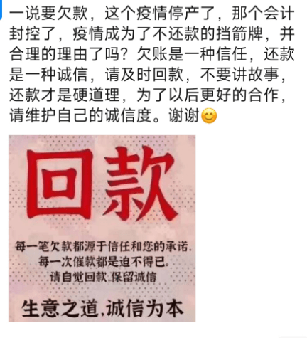 有網友表示,疫情成了不還款的擋箭牌。一說要欠款就說停產了,會計封控了。疫情是暫時的,信譽是長久的,大家都在疫情中,都很艱難。