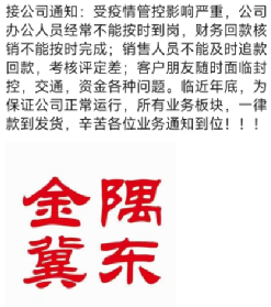 金隅冀東某公司因公司通知,受疫情影響,辦公室人員經常不能按時到崗,財務回款核銷不能按照完成,銷售人員不能及時追款回款,考核評定差,客戶朋友又隨時面臨封控,交通,資金各種問題,臨近年底,為保證公司正常運行,所有業務板塊一律款到發貨。