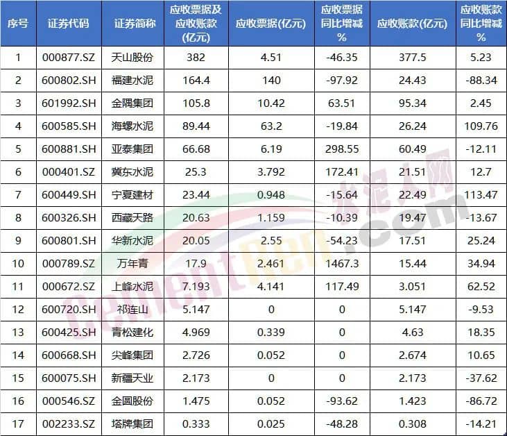 海螺水泥應收賬款同比增加超100%,萬年青應收票據大增1467.3%