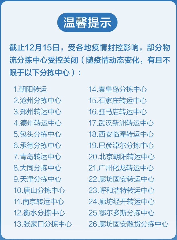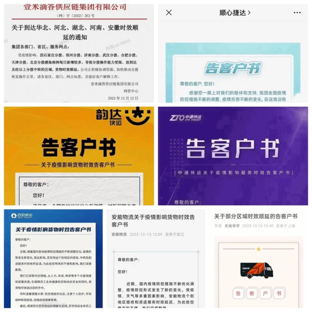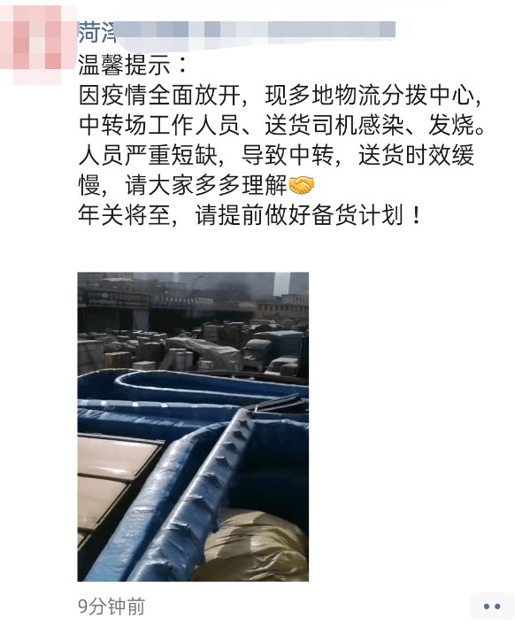 山東菏澤一企業溫馨提示稱:“因疫情全面放開,現多地物流分撥中心中轉場工作人員、送貨司機感染、發燒人員嚴重短缺,導致中轉,送貨時效緩慢,請大家多多理解個年關將至,請提前做好備貨計劃!”