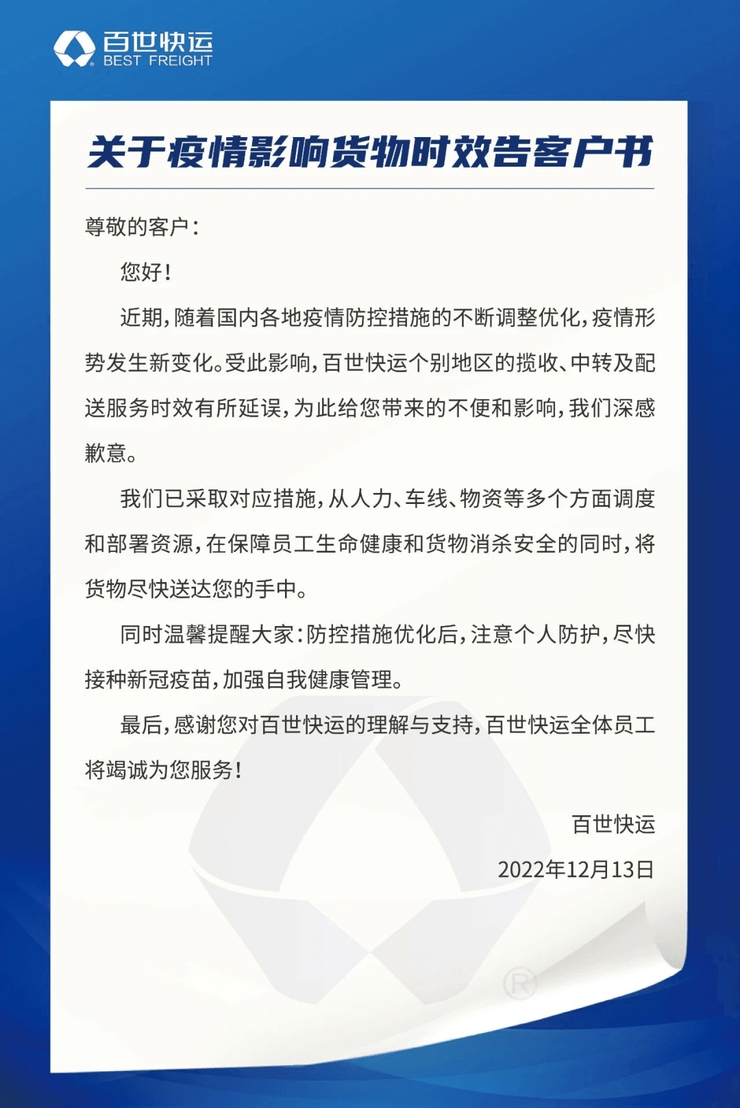 百世快運表示,隨著國內各地疫情防控措施的不斷調整優化,疫情形勢發生新變化,受此影響,百世快運個別地區的攬收、中轉及配送服務時效有所延誤。