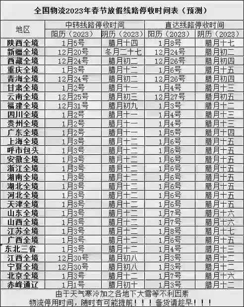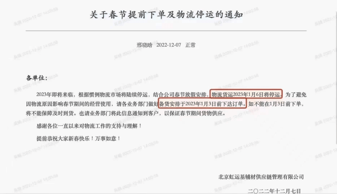 北京虹運基輔材供應鏈管理有限公司通知,綜合公司春節放假安排,物流貨運2023年1月6日將停運,請各業務部門2023年1月3日前下達訂單,如果不能在1月3日前下單,將不能保障及時到貨。