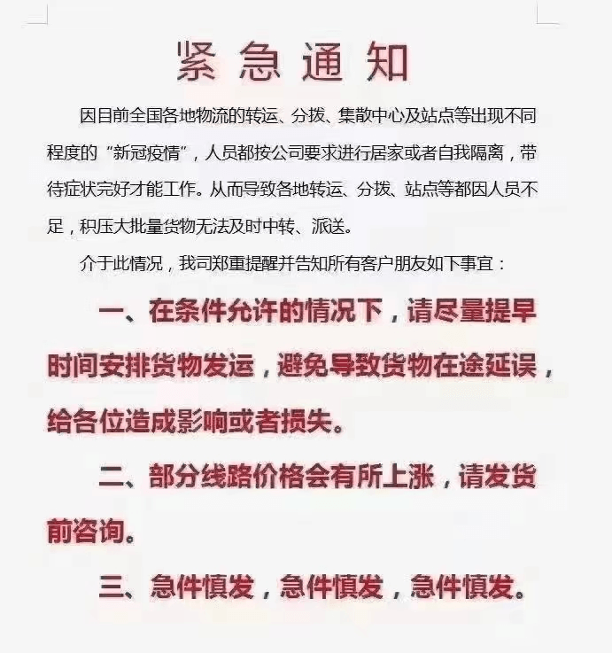 因疫情影響,順心捷達、安能物流、中通快運、百世快運、韻達快運、壹米滴答、華宇物流等快運公司相繼發布了告客戶書,告訴客戶受疫情影響比較嚴重,可能會出現送發貨不及時甚至部分地區不發貨情況。