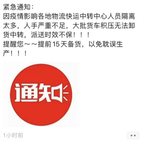 另一企業發緊急通知稱:“因疫情影響各地物流快運中轉中心人員隔離太多,人手嚴重不足,大批貨車積壓無法卸貨中轉,派送時效不保!!!提醒您:提前15天備貨,以免耽誤生產!”