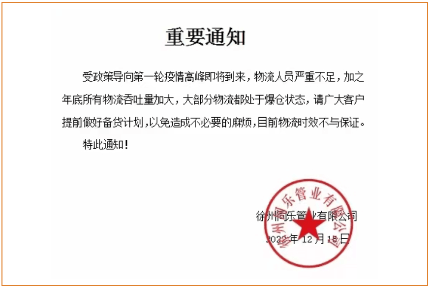 徐州同樂管業重要通知:“受政策導向第一輪疫情高峰即將到來,物流人員嚴重不足,加之年底所有物流吞吐量加大,大部分物流都處于爆倉狀態,請廣大客戶提前做好備貨計劃,以免造成不必要的麻煩,目前物流時效不保證。”