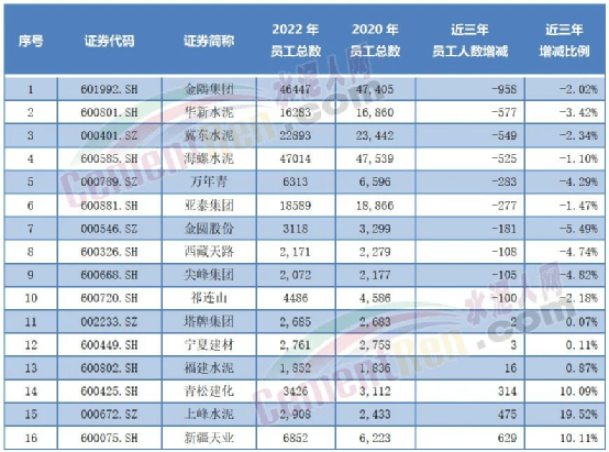 近三年金隅集團、華新水泥、冀東水泥、海螺水泥等10家企業減員超100人及以上,其中金隅集團減員958人,華新、冀東、海螺減員500人以上。