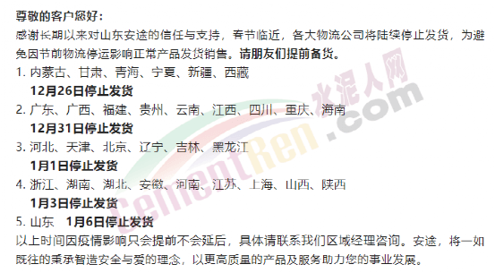 廣州慶帆翔材料科技有限公司通知,江蘇、浙江發貨時間中轉物流2023年1月6~8日逐步停止發貨,直到物流2023年1月11日停止收貨;山東發貨時間,中轉物流2023年1月6日左右逐步停止發貨,直達物流2023年1月10日左右停止收貨,2023年1月30日逐步恢復發貨。百世快運截止收貨時間大約2023年1月6-11日。