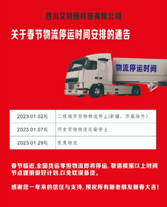 四川艾特施科技通知,2023年1月2日起二級城市貨物物流停止(新疆、西藏除外)。2023年1月7日起所有貨物物流運輸停止。2023年1月29日起,恢復物流。