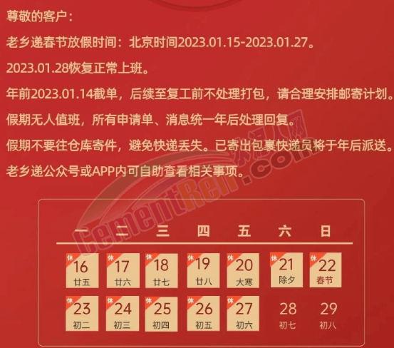 “老鄉遞”春節放假時間為2023年1月15日至1月27日,1月28日恢復正常上班。年前2023年1月14日截單,后續至復工前不處理打包。假期無人值班,所有申請單,消息統一年后處理回復。同時提示,假期不要往倉庫寄件,避免快遞丟失。已寄出包裹快遞員將于年后派送。