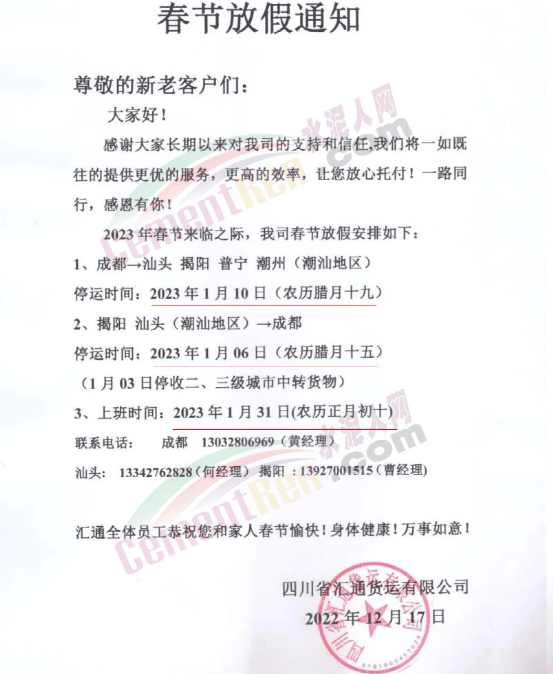 四川省匯通貨運有限公司:成都→汕頭揭陽普寧潮州(潮汕地區)停運時間:2023年1月10日(農歷臘月十九)揭陽汕頭(潮汕地區)→成都。停運時間:2023年1月06日(農歷臘月十五)。1月03日停收二、三級城市中轉貨物。上班時間:2023年1月31日(農歷正月初十)
