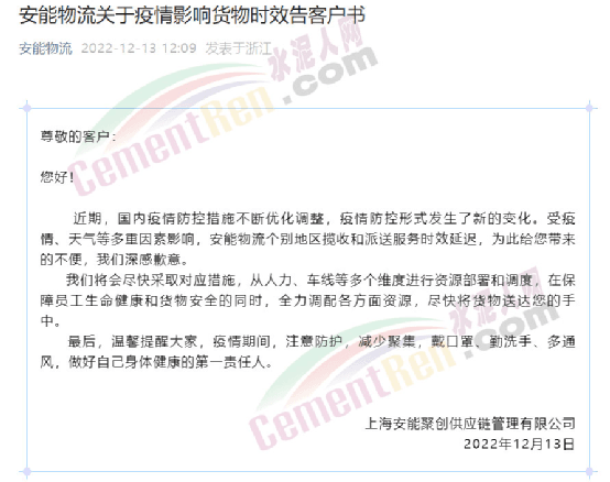 上海安能聚創供應鏈管理有限公司通知稱,近期,國內疫情防控措施不斷優化調整,疫情防控形勢發生了新的變化。受疫情、天氣等多重因素影響,安能物流個別地區攬收和派送服務時效延遲。