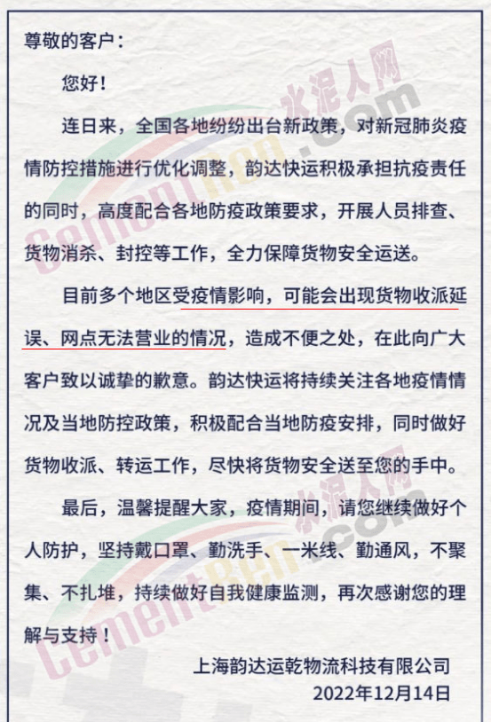 上海韻達運乾物流科技有限公司通知,連日來,全國各地紛紛出臺新政策,對新冠肺炎疫情防控措施進行優化調整,目前多個地區受疫情影響,可能會出現貨物收派延誤、網點無法營業的情況,造成不便之處,在此向廣大客戶致以誠摯的歉意。