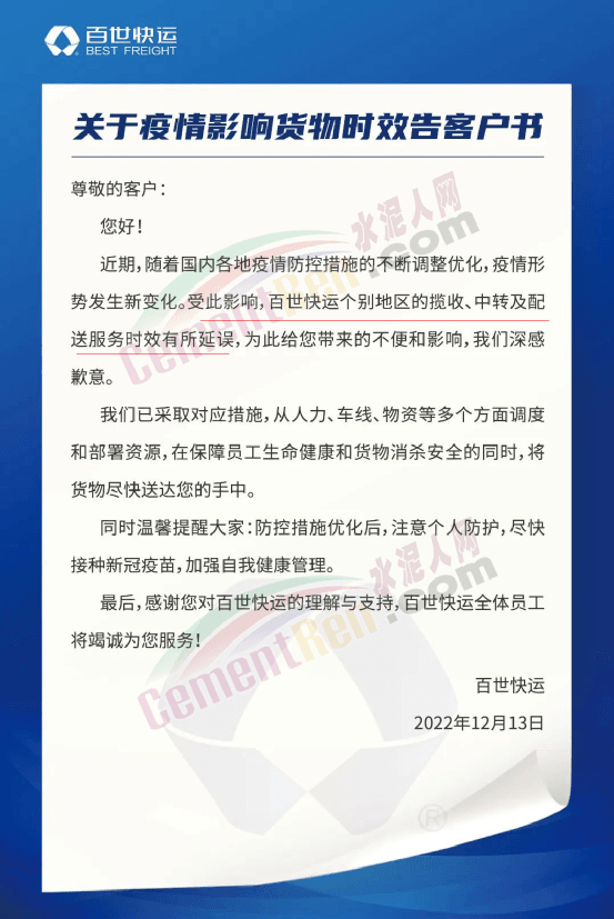 中通快運關于疫情影響服務時效告客戶書稱:近期,全國各地因時因勢優化調整疫情防控措施,疫情防控進入新的關鍵階段。受疫情原因影響,中通快運在個別地區可能出現服務時效延誤情況,如給您帶來不便,在此致以誠摯的歉意。將密切關注疫情形勢變化,落實防疫要求,保障員工生命健康和貨物安全;同時積極調配各方資源,全力做好貨物收派、轉運工作,盡快將貨物安全送至您的手中。